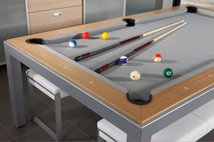 Designed in Belgium, the table shifts seamlessly from a pure design object, into a roomy dining table, transformable in seconds into a game table or a quality billiard table to accompany your after dinner drinks. Its patented leg riser system allows it to rise from standard dining table height to regulation billiard table height in seconds.
