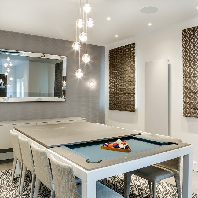 Designed in Belgium, the table shifts seamlessly from a pure design object, into a roomy dining table, transformable in seconds into a game table or a quality billiard table to accompany your after dinner drinks. Its patented leg riser system allows it to rise from standard dining table height to regulation billiard table height in seconds.